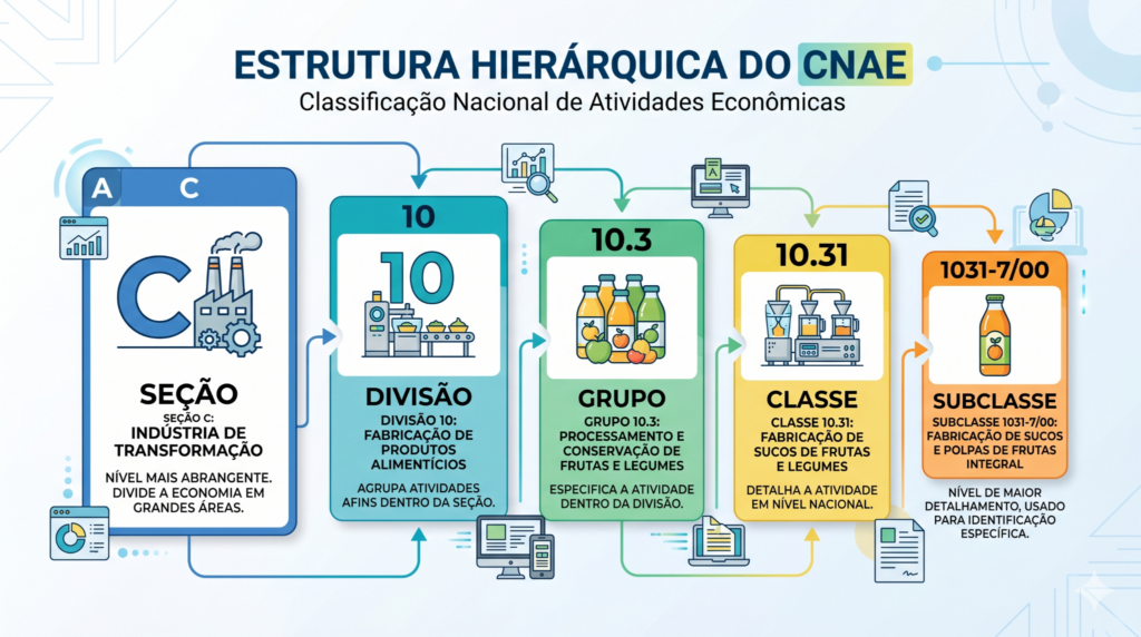 Posteriormente, é importante notar que o código é composto por sete dígitos, divididos em cinco níveis hierárquicos. Em princípio, temos as seções, divisões, grupos, classes e, por fim, as subclasses. Antes de tudo, a definição correta desses números no momento da abertura do CNPJ garante que a empresa não pague impostos indevidos ou sofra multas por desvio de atividade.